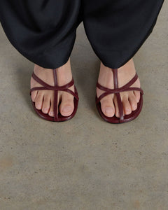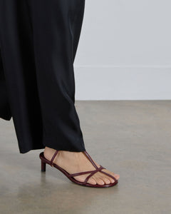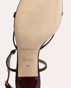 Thin leather strap upper. Leather insole wrap and sock. Lacquered mid heel.